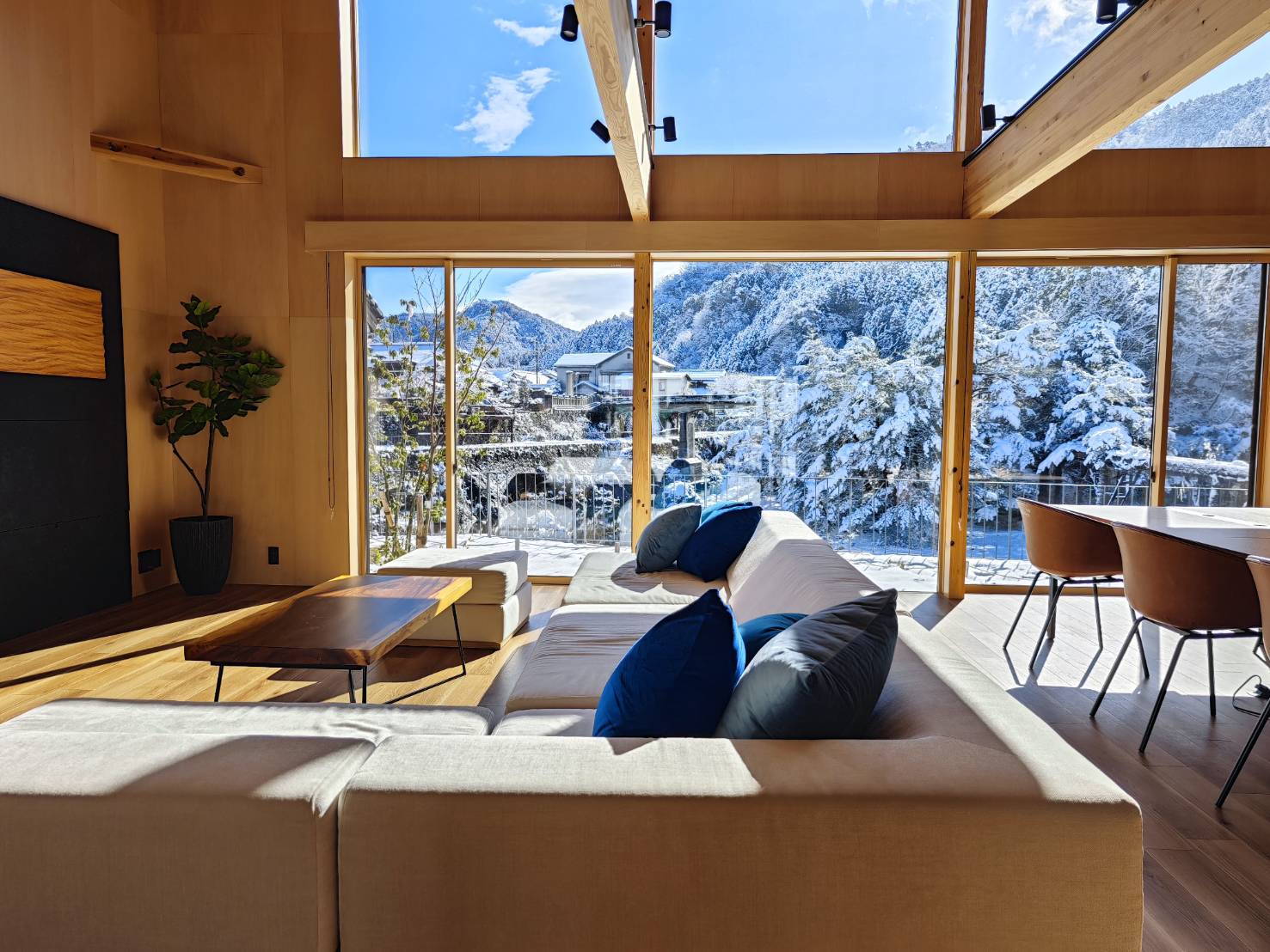 通りに面した窓からは高山の町並み、玄関からは日本の長屋ならではの奥行き深い眺め、中庭に差し込む光からは高山の四季を感じることができます。