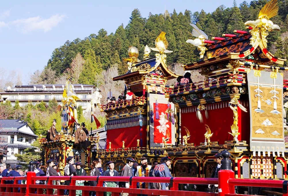 飛騨の匠の技を伝える「高山祭」の屋台は、春・秋ともに国の重要有形民俗文化財に指定されており、春は12台が勢揃いします。