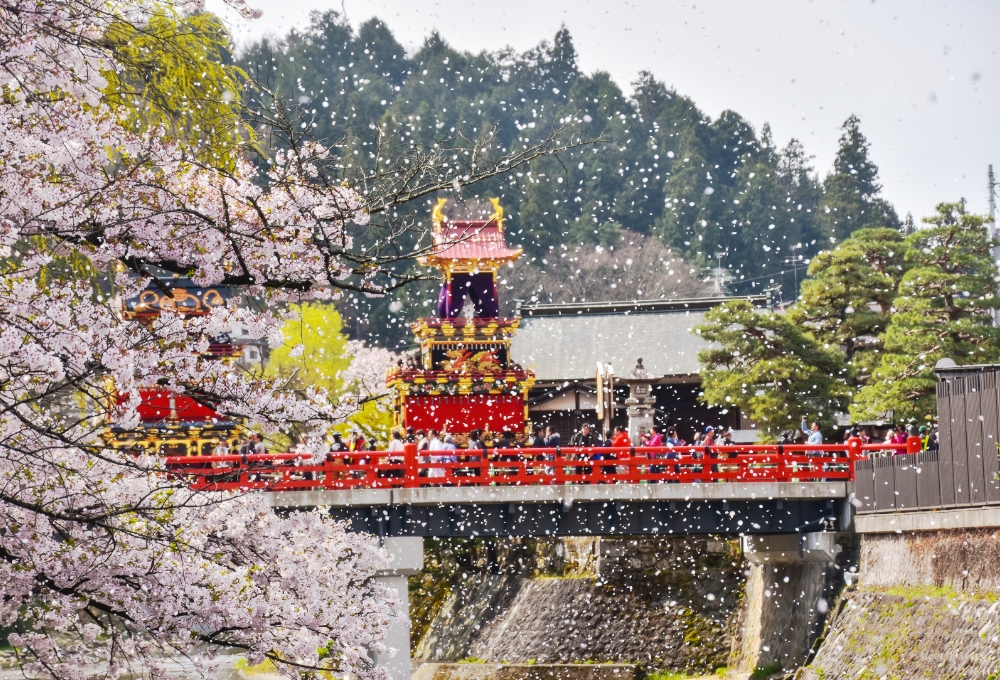 春の高山祭(山王祭)は旧高山城下町南半分の氏神様である日枝神社の例祭で毎年4月14日・15日に開催されます。祭の起源は飛騨の領国大名金森氏の時代(1585年から1692年)、屋台の起こりは1718年頃といわれ、巧みな人形の動きを披露するからくり奉納や、仕掛けが施された戻し車など、匠の技が生きています。